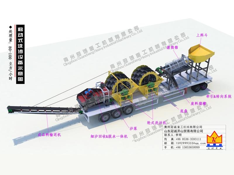 該產(chǎn)品為80-100立方移動(dòng)式洗砂設(shè)備,采用車載輪胎式移動(dòng),搭配兩臺(tái)三排輪斗洗沙機(jī),加裝移動(dòng)細(xì)沙回收脫水設(shè)備,操作簡(jiǎn)單,流動(dòng)式作業(yè),隨洗隨走,省卻了打底座的煩惱,省時(shí)高效。