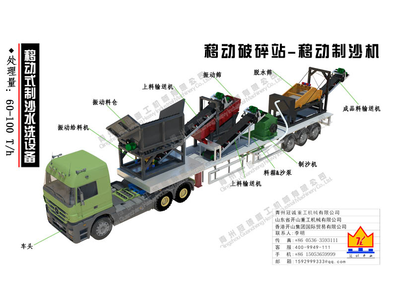 本套移動(dòng)破碎站為移動(dòng)式制沙水洗設(shè)備,處理量為每小時(shí)60-100噸,本移動(dòng)破碎站是青州冠誠(chéng)重工機(jī)械有限公司獨(dú)立設(shè)計(jì)制作而成,直接采用17.5米半掛車底盤改裝制作,其優(yōu)勢(shì)如下: