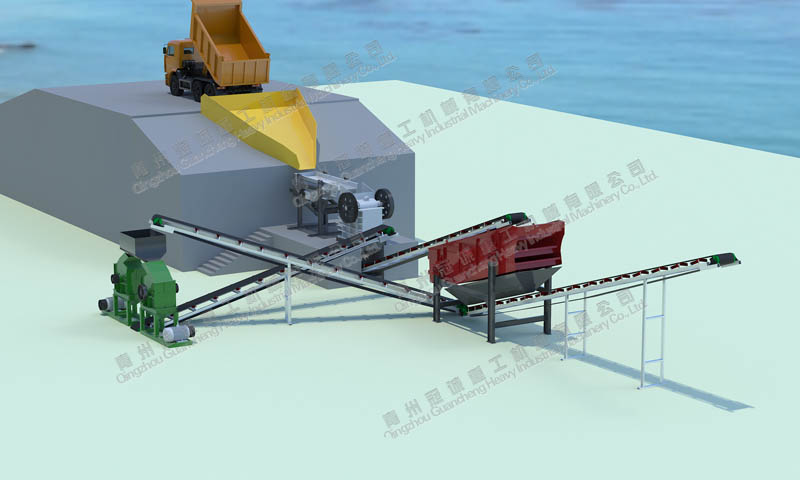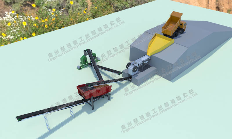 原料通過工程車輛送入進料斗,由進料斗進入振動給料機內(nèi)均勻給料進入一臺600*900鍔式破碎機或者一臺1416#重錘破碎機內(nèi)進行粗破,破碎后的物料通過上料輸送機送入一臺2160#振動篩內(nèi)進行篩選分級為:4mm以下與4mm以上兩種規(guī)格;