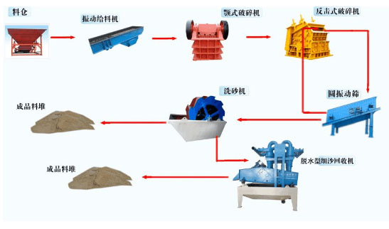 對于一套完整的水洗砂生產(chǎn)線來說,其除了包含有洗砂機(jī)這一核心洗砂設(shè)備外,其肯定還會含有制砂機(jī),甚至還有粗、細(xì)碎破碎機(jī)(通常情況下,多為顎式破碎機(jī)與反擊式破碎機(jī)),用于完成對大塊砂石物料的粗、細(xì)碎作業(yè)。具體各設(shè)備之間配合生產(chǎn)工藝流程如下:
